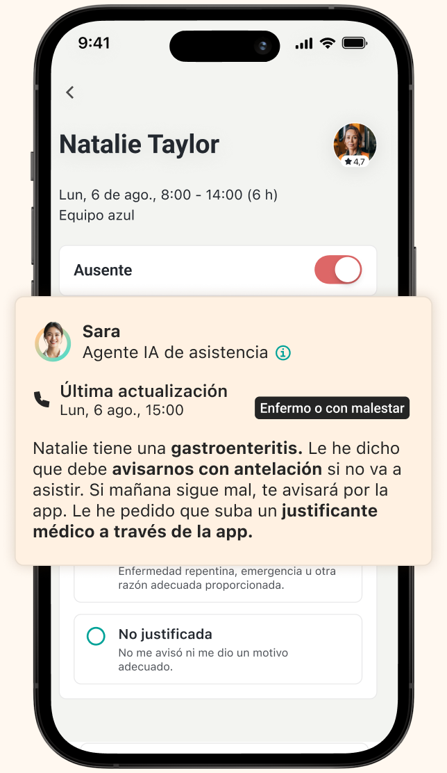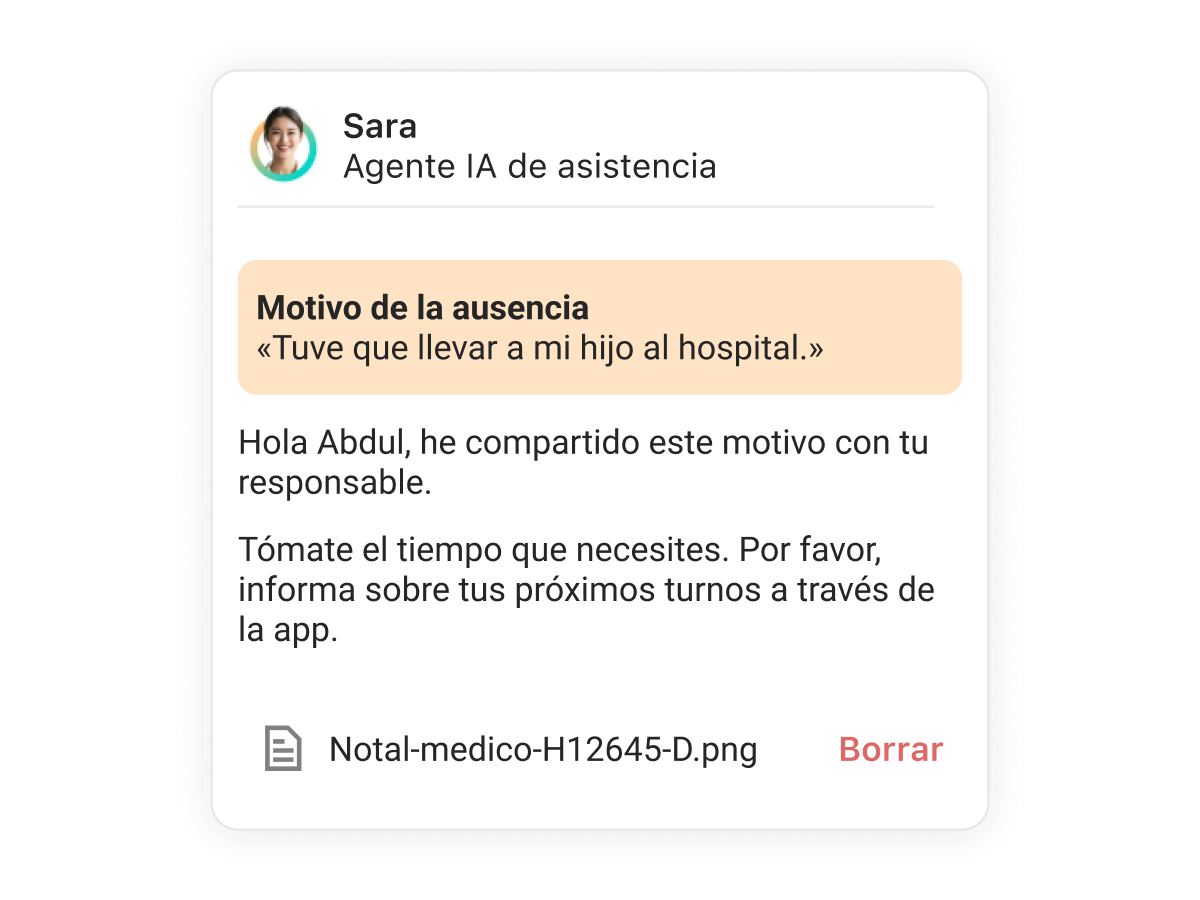 Cuando un trabajador falta a su turno, Sara reacciona al instante: investiga la ausencia, informa y actualiza a supervisores y trabajadores, y mejora tu asistencia sin que tengas que mover un dedo.