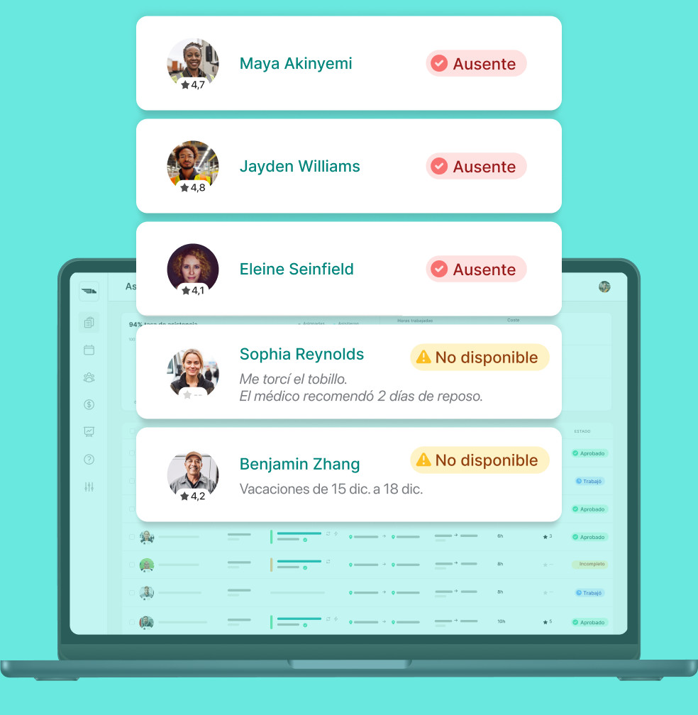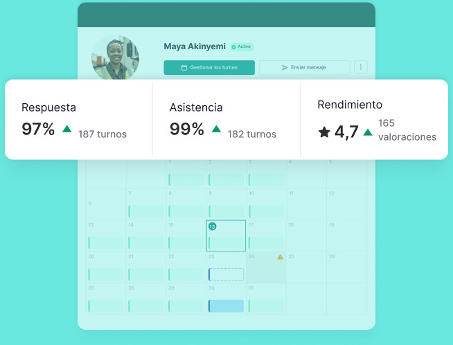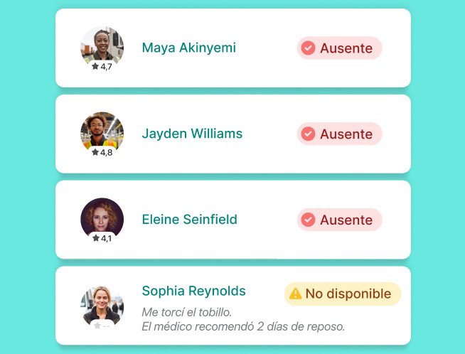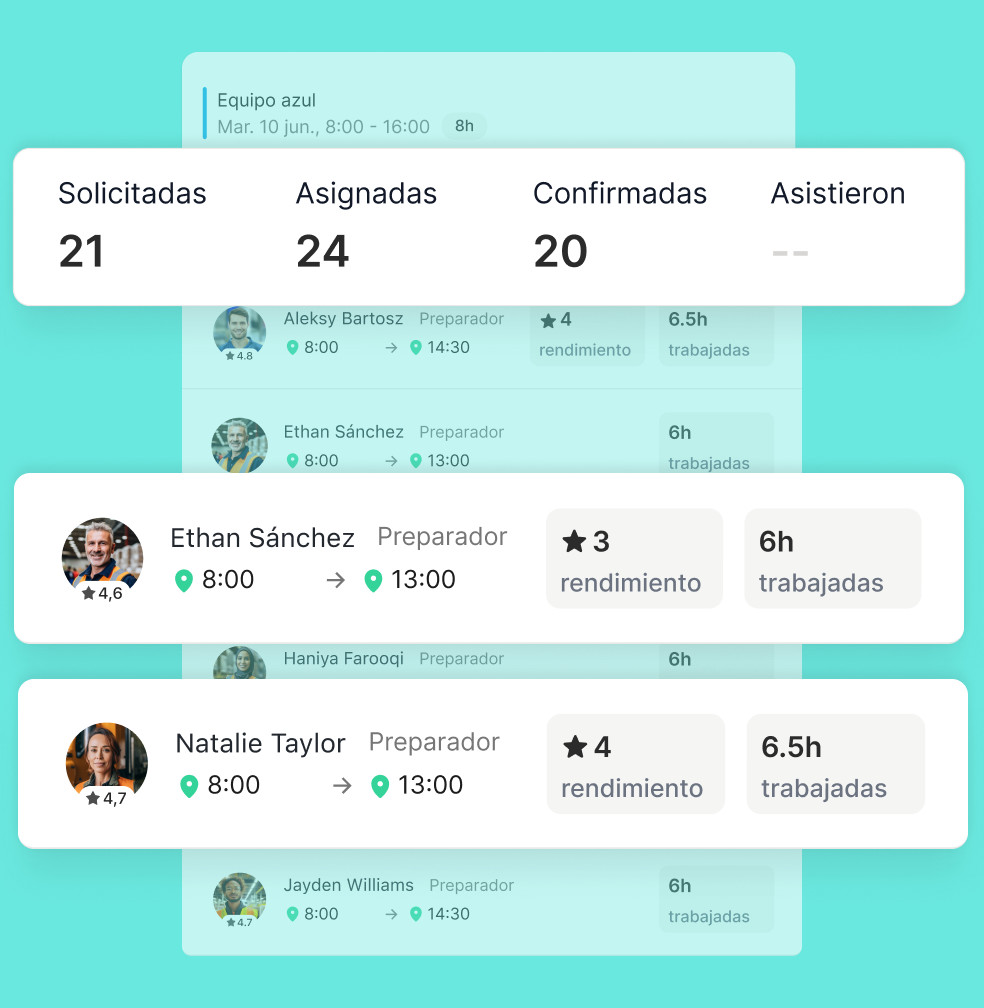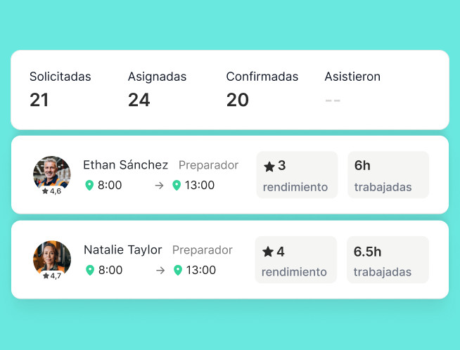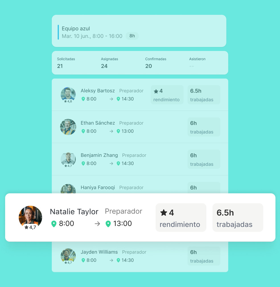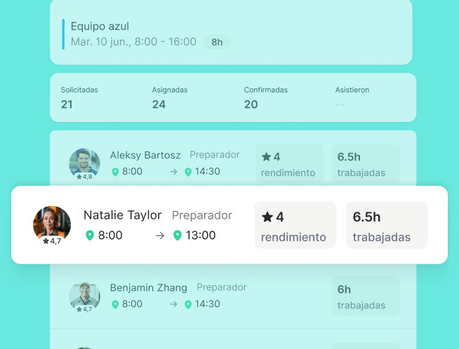 En la app Job&Talent Business, puedes ver en el momento quién ha confirmado la asistencia a cada turno, quién estará ausente o cuáles las horas de entrada y salida de un turno.