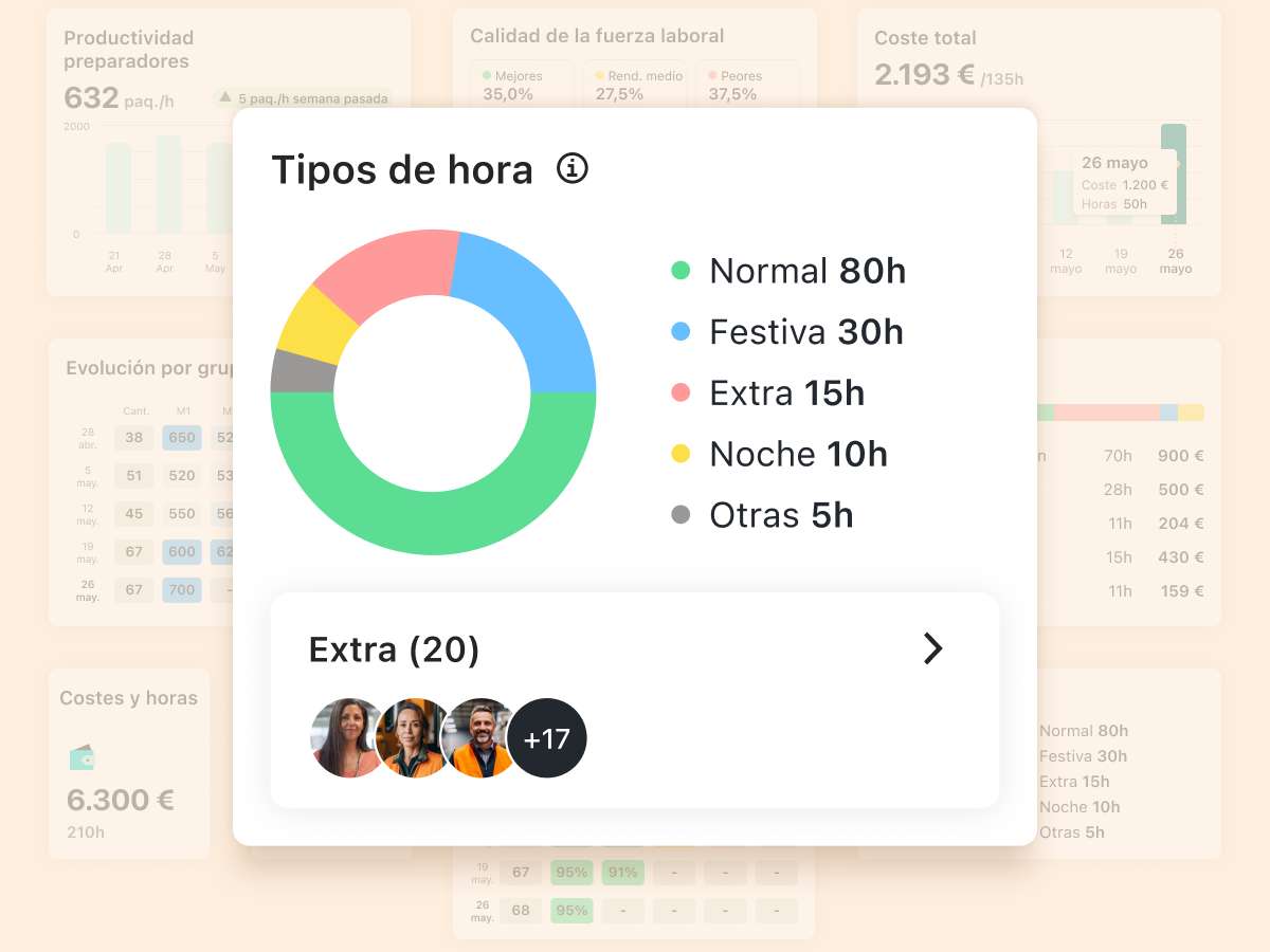 Nuestro sistema de registro de horas te dará la visibilidad y el control que necesitas para reaccionar rápidamente a cualquier imprevisto. Saca el máximo provecho a los informes de datos para mantener la productividad y el cumplimiento en cada turno.